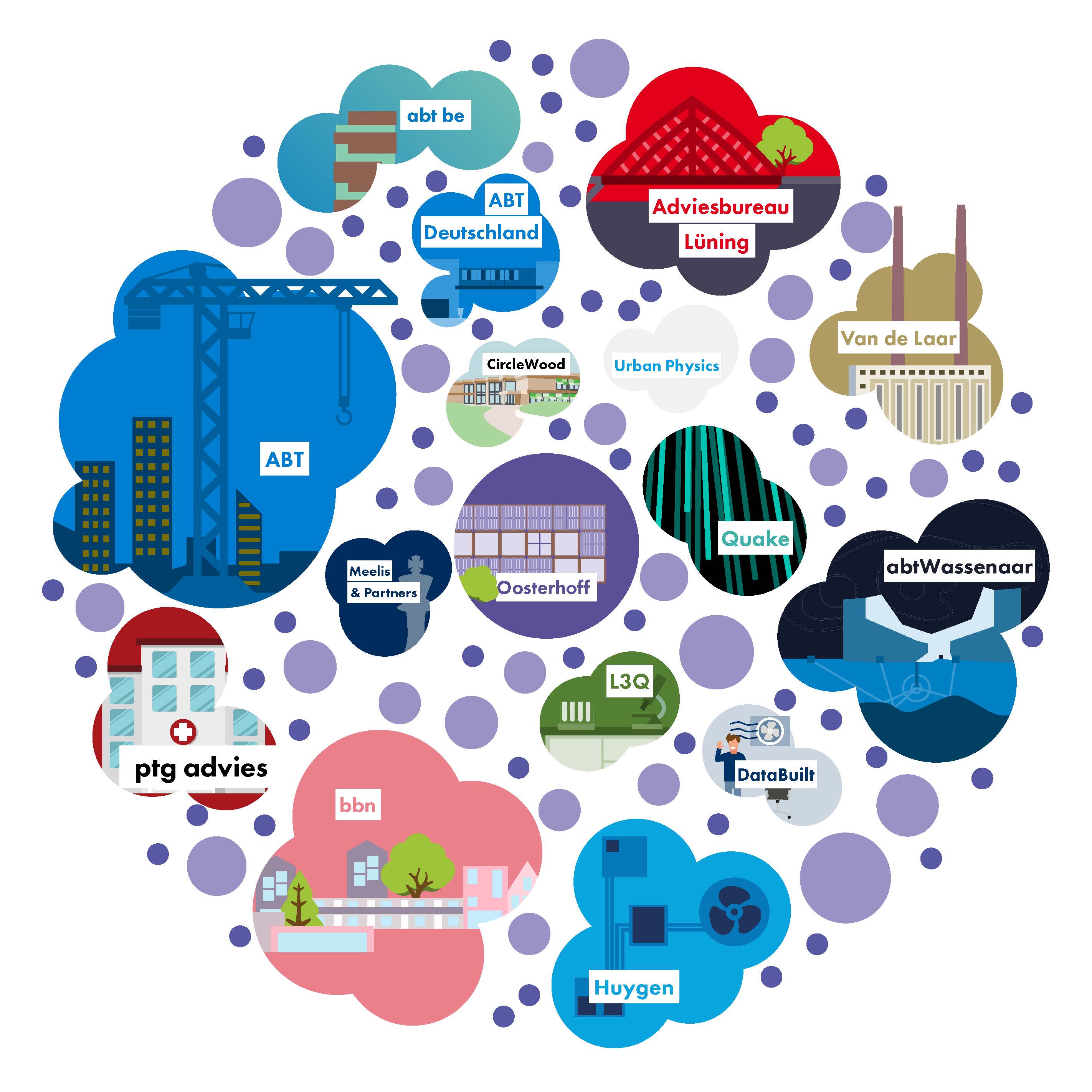 Oosterhoff bestaat uit ABT, abt be, ABT Deutschland, abtWassenaar, Adviesbureau Lüning, bbn adviseurs, CircleWood, DataBuilt, Huygen, L3Q, Meelis & Partners, ptg advies, Urban Physics, Van de Laar en Quake.